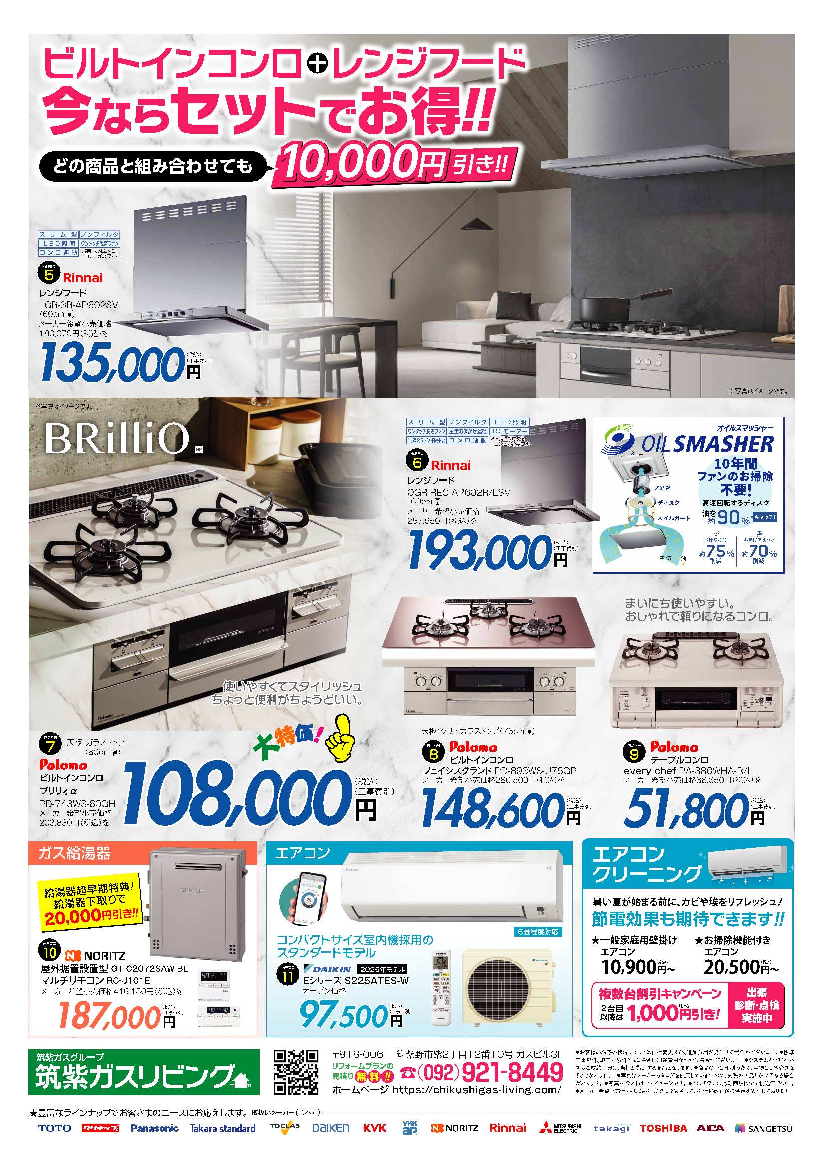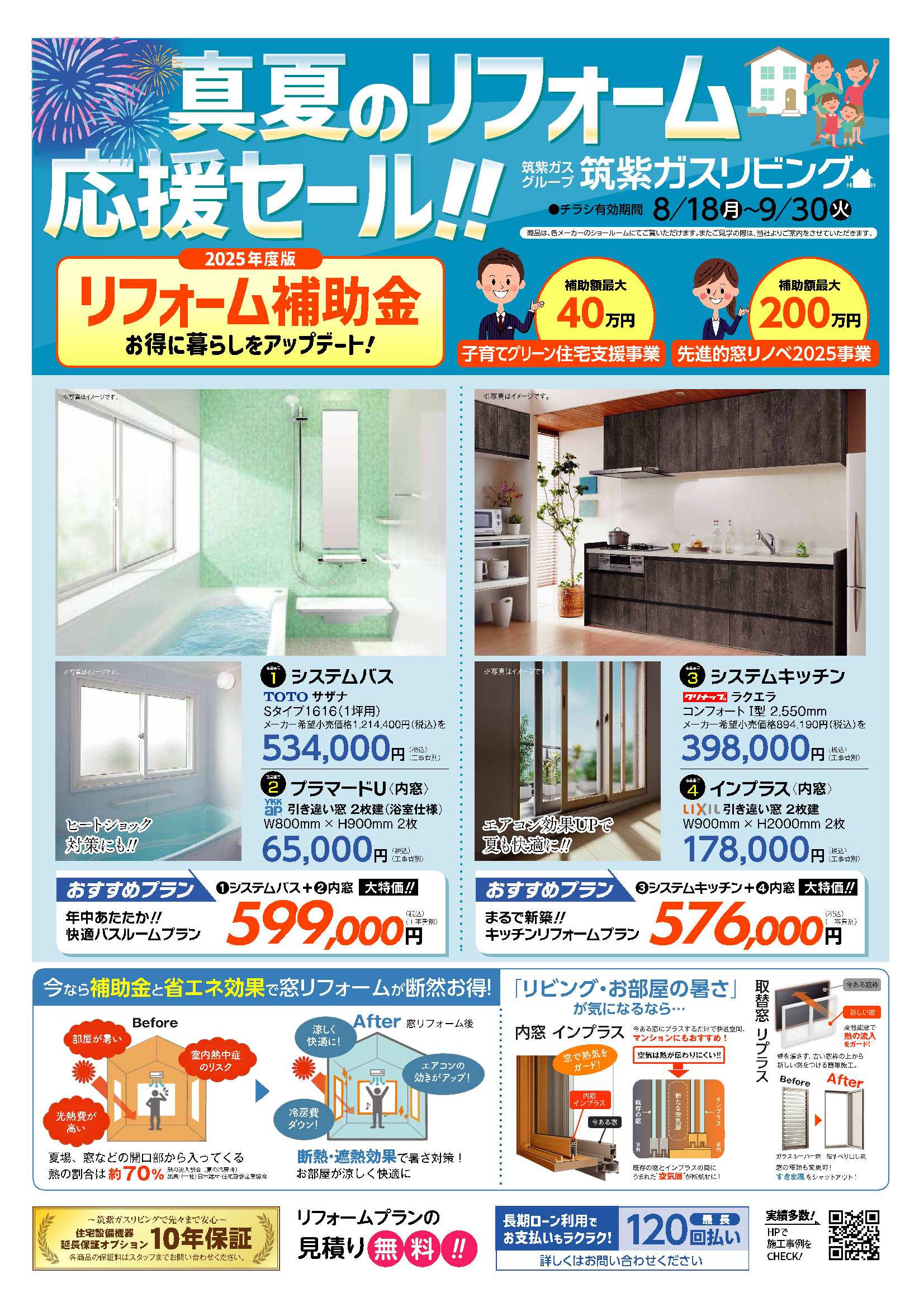 2025年8月24日 / 最終更新日 : 2025年8月24日 HACHIYARUMI お知らせ ガス機器がお得に!期間限定 真夏のリフォーム応援セール!! こんにちは! いつも筑紫ガスリビングを ご愛顧いただきありがとうございます。 期間限定企画!!おトクな「真夏のリフォーム応援セール」を開催中です! まだまだ暑い日が続いていますが、 給湯器の下取り支援を活用して お得にガス機器を購入して冬の準備もしてみませんか?(*^-^*) もちろん、お風呂やキッチン、洗面所のリフォームもご一緒にご相談いただけます。 このキャンペーンは、9月までの期間限定です。お見積もりは無料ですので、まずはお気軽にご相談ください。